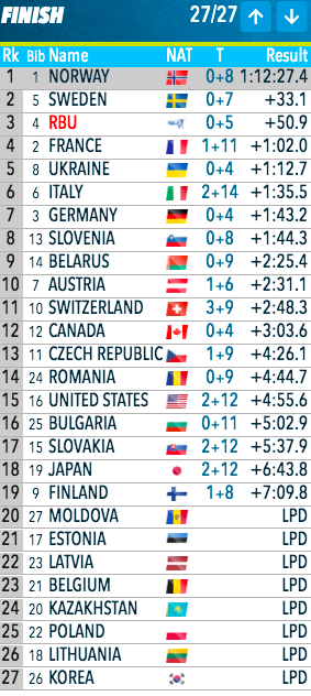 Топ-3 гонки: первое место — Норвегия (1:12:27,4), второе — Швеция (+33,1 секунды), третье — Россия (+50,9).