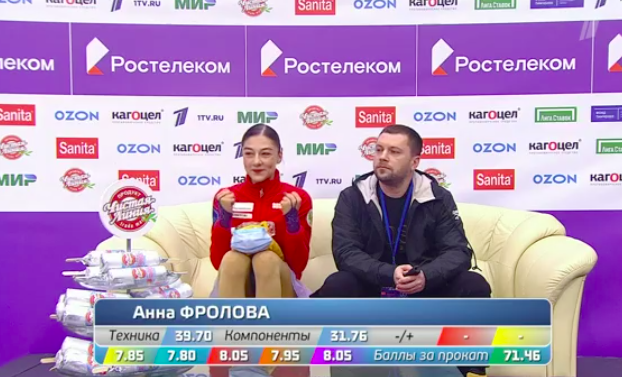 За свой прокат Фролова получает 71,46 балла. Девушка торжествующе сжимает кулачки — это ее лучший результат в сезоне.