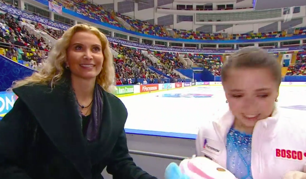 Фигуристка уже буквально рыдает в kiss-and-cry. Кажется, в голову девушки уже закрались мысли о том, что на чемпионат мира она не пробьется.