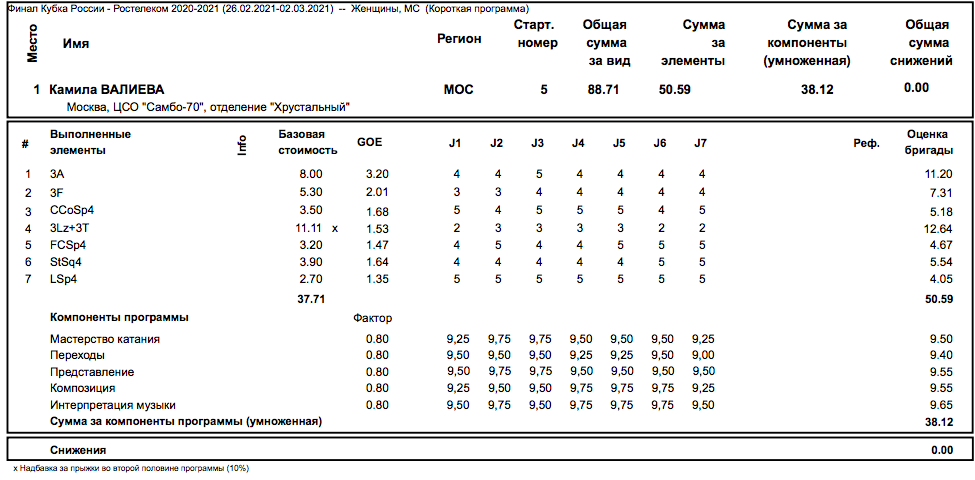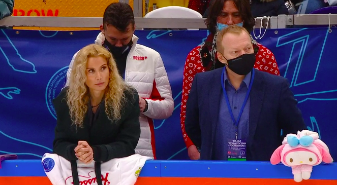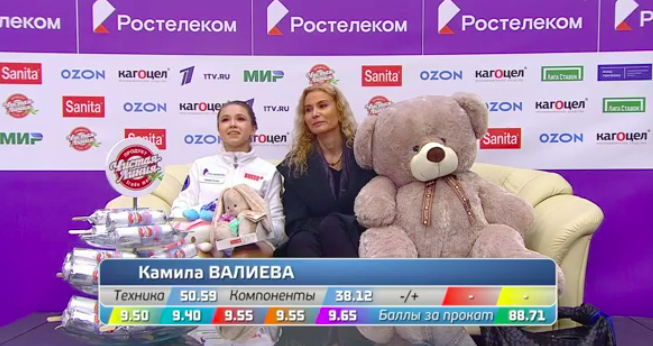За свой прокат Валиева получает 88,71 балла — на десять баллов больше, чем предыдущий лидер таблицы Туктамышева! Тутберидзе шутливо машет лапой огромного подаренного ученице медведя — наставница в отличном настроении.