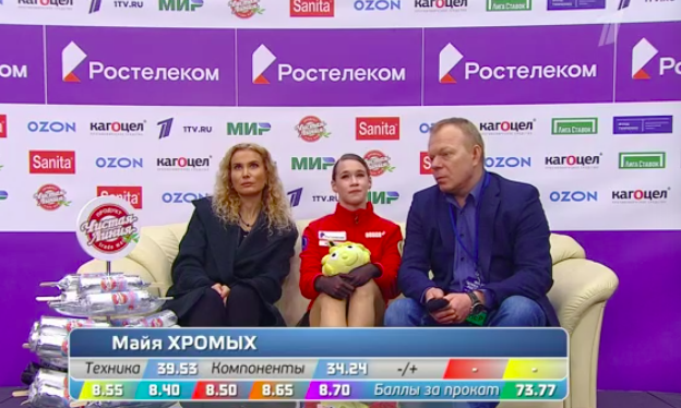 Открывает выступления второй группы участниц Майя Хромых — ученица Тутберидзе, которая катается под харизматичный блюз «I'll Take Care Of You».
