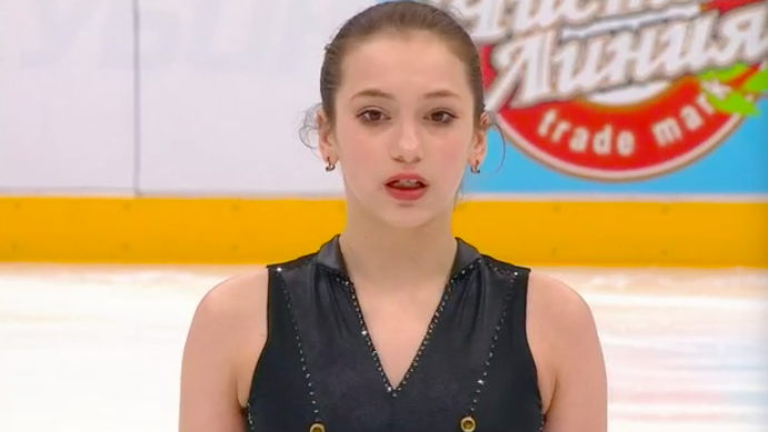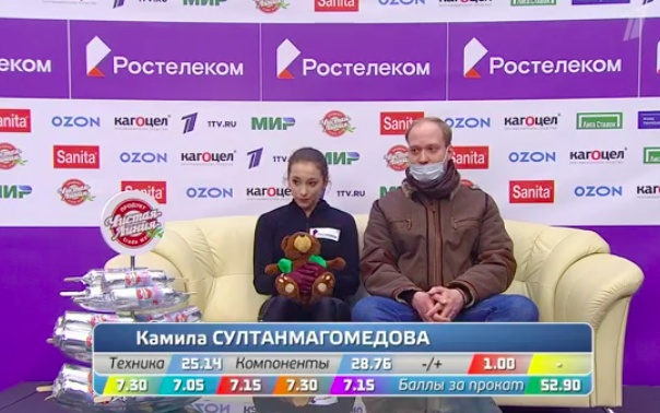 Следующей выступит Камила Султанмагомедова — пока не очень известная, но подающая надежды фигуристка, которая тренируется в «Самбо-70», но не у Тутберидзе, а в другом отделении под названием «Конек Чайковской». Девушка явно очень нервничала перед выходом на лед. Пожелаем удачи! Катается Камила под «Seven Nation Army» в джазовой обработке.