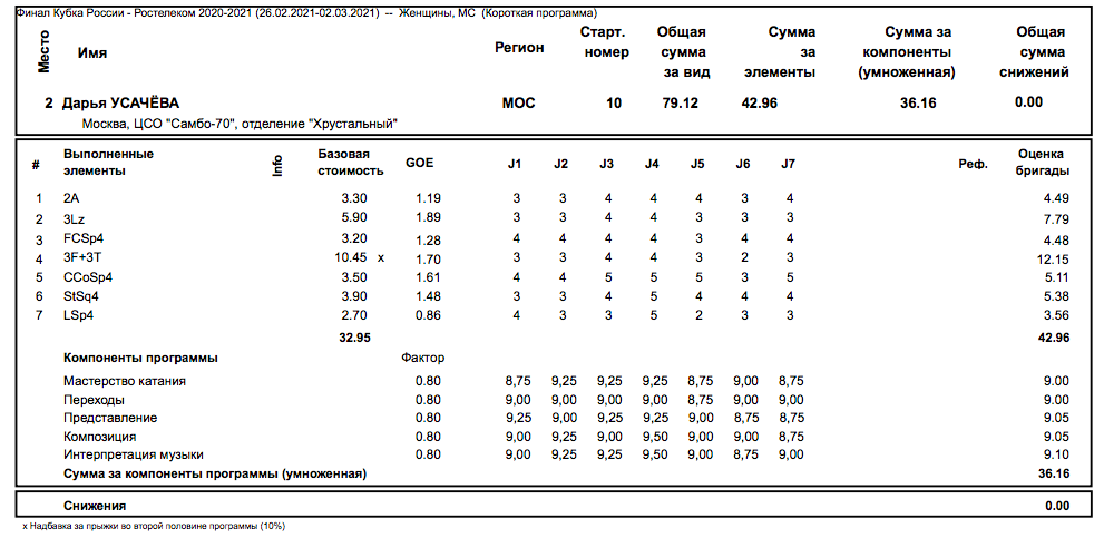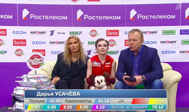 За свой прокат Усачева получает 79,12 балла и занимает промежуточное второе место, обходя Туктамышеву, которая исполнила тройной аксель сегодня.