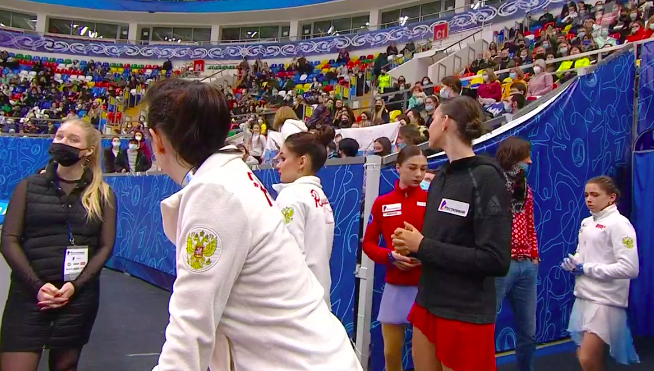 Тутберидзе внимательно наблюдает за прыжками своих учениц на разминке. Тем временем Туктамышева исполняет чистейший тройной аксель — публика взрывается аплодисментами.