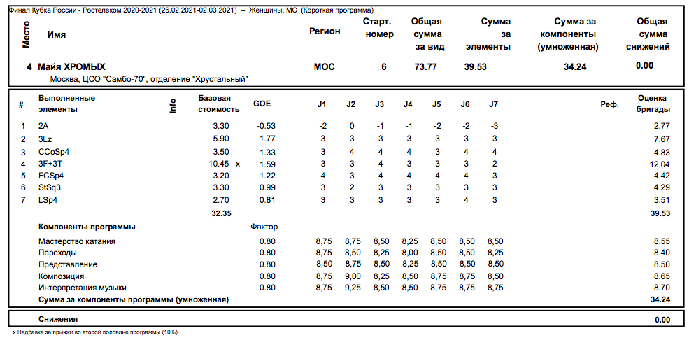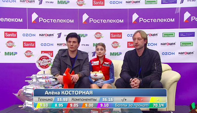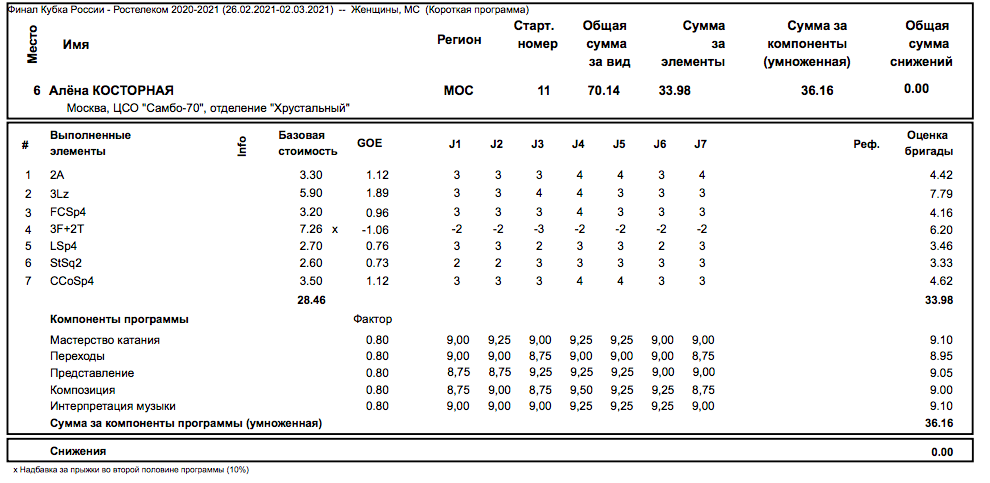 За свой прокат Косторная получает 70,14 балла и занимает лишь шестое промежуточное место. Все-таки отсутствие стартов на протяжении трех месяцев и абсолютно новые программы сделали свое дело — не было нужной уверенности и тонуса, что привело к серьезной ошибке на финальном каскаде.