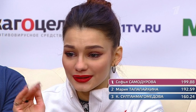 В начале проката флип, конечно, должен был быть не двойным, а тройным, но это единственное, что не получилось у Самодуровой. 130,96 за прокат. Новый лидер.