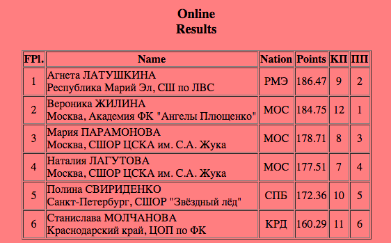 За свой прокат Латушкина получает 123,47 балла, а в сумме — 186,47. Фигуристка из Марий Эл обгоняет Жилину и занимает промежуточное первое место.