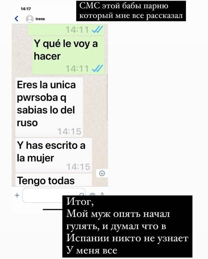 «Мой муж опять начал гулять. Думал, что в Испании никто не узнает. У меня все. Спасибо за сборы, ФК «Ростов», — написала Алана в Instagram (владелец компания Meta признана в России экстремистской и запрещена), опубликовав несколько изображений: фото личных документов «любовницы» по имени Ирен Гарсия Морено, скриншот с номером ее телефона, а также переписку девушки со своим знакомым, который и принял решение рассказать Мамаевой о произошедшем.