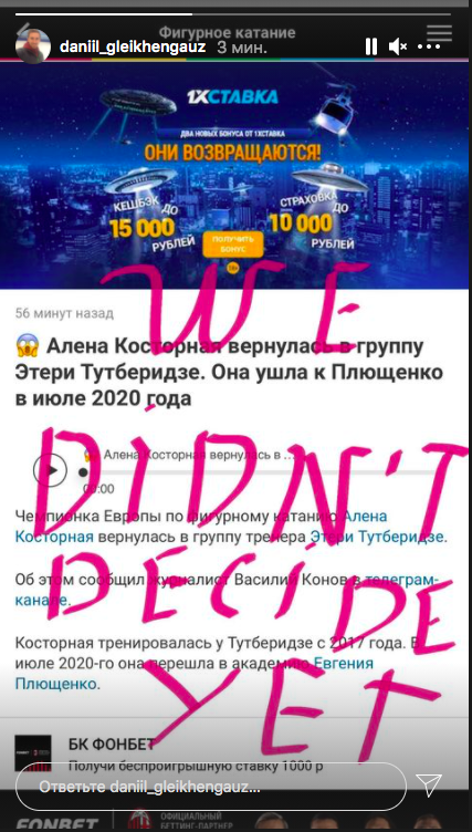 Однако затем что-то резко изменилось. Один из тренеров и главный хореограф группы Даниил Глейхенгауз написал в Instagram (владелец компания Meta признана в России экстремистской и запрещена) Stories «Мы еще не решили», перекрыв этими словами скриншот новости о том, что Косторная якобы уже перешла.