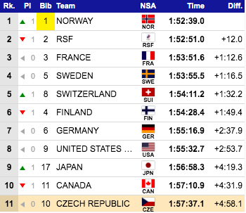 Поздравляем Норвегию с золотом, Россию — с серебром (+12 секунд), а Францию — с бронзой (+1:12,6 минуты)!