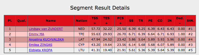 Лучший результат принадлежит сейчас фигуристке из Нидерландов Линдси ван Зундверт, которая набрала 57,72. Но, как мы упоминали в начале трансляции, рейтинг спортсменок повышается с каждой новой группой, так что не стоит корить девушек из первой группы — они еще в начале своего пути.
