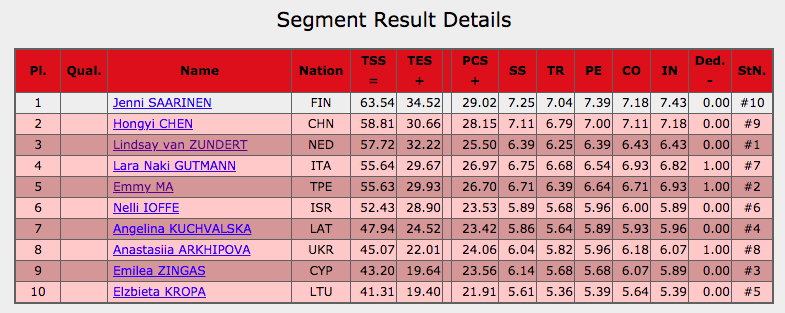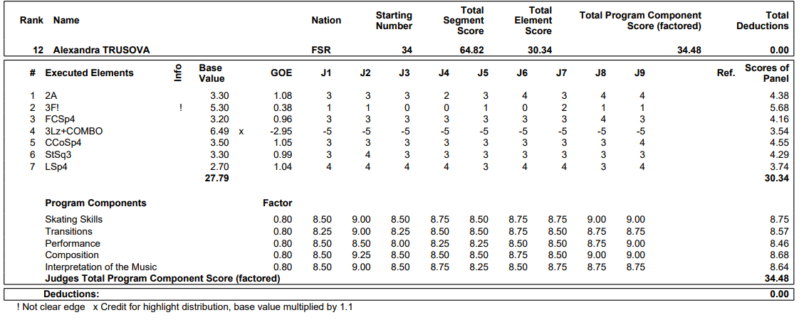 Протокол оценок Саши Трусовой (картинка кликабельна). Судьи отметили неясное ребро на тройном флипе, за что снизили бонусы по шкале GOE, ну и, конечно, отсутствие каскада тройной лутц + тройной тулуп. Из-за этих ошибок понизились и компоненты — они колеблются от 08,25 до 08,75 в среднем.