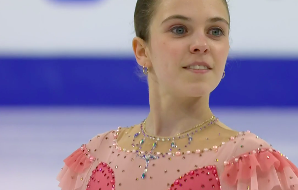 Первой в этой разминке выступает россиянка Александра Трусова! Девушка катается в нежно-фиолетовом плате под лиричные композиции «Love Story» (Lola and Hauser) и «Appassionata» (Secret Garden).