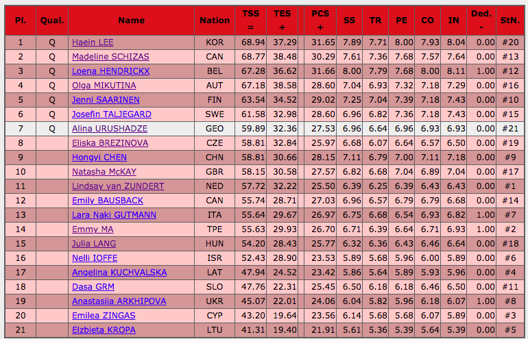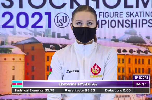 За свой прокат Рябова (Азербайджан) получает 64,11 балла (это ее личный рекорд за короткую программу) и уверенно пробивается в произвольную!