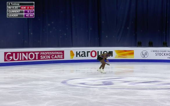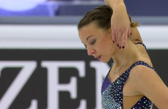Опасно! Николь едва удержала равновесие и сильно наклонилась вперед после тройного тулупа, так что потом с трудом присоединила к нему лишь двойной тулуп. Получился каскад 3+2 вместо 3+3, а это серьезная потеря баллов.