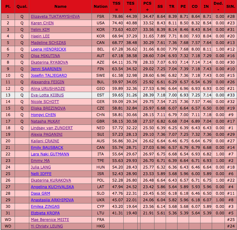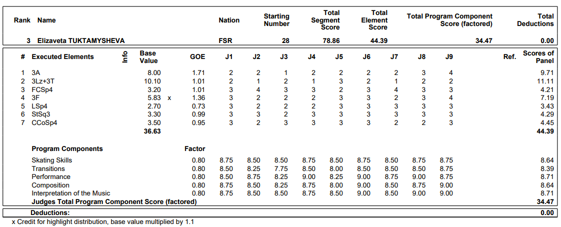Протокол оценок Елизаветы Туктамышевой (картинка кликабельна). Явных ошибок или недокрутов судьи у нее не обнаружили, но проставили компоненты ниже, чем Щербаковой и Кихире. Также не очень высокими оказались дополнительные бонусы за прыжки и вращения по шкале GOE (Grade of Execution).