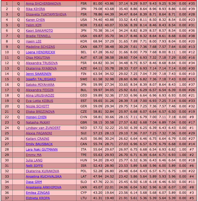 Участницы уже вплотную подобрались к 70 баллам (уровень растет от разминки к разминке), но за этот порог еще никто не перешагнул. Лучший результат пока у канадской фигуристки Мэдлин Шизас, которая набрала 68,77 балла.