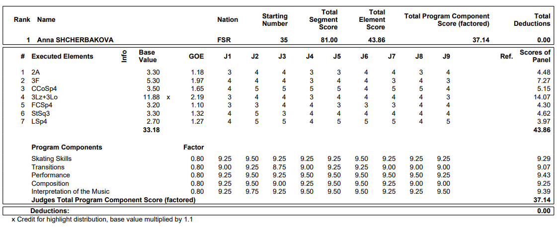 Подробный протокол оценок Анны Щербаковой. Судьи не нашли ни одной ошибки, а оценки за компоненты выстроились от 09,00 до 09,50. Отличный результат!