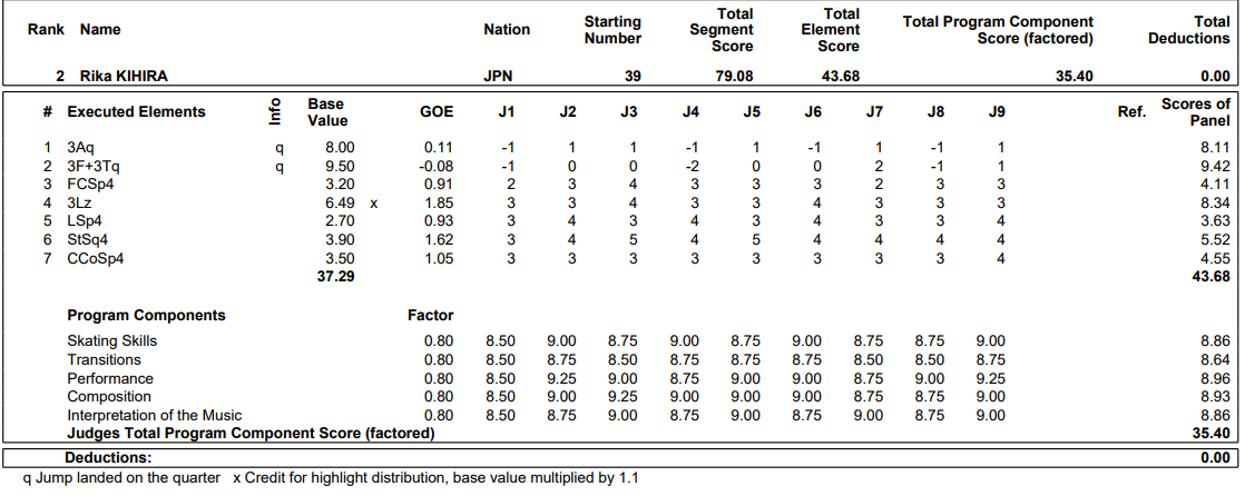 Протокол оценок Рики Кихиры. Судьи отметили знаком «q» недокруты в четверть оборота (90 градусов) на двух прыжках — тройном акселе и тройном тулупе, что существенно снизило бонусы за эти прыжки.