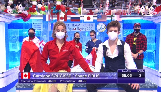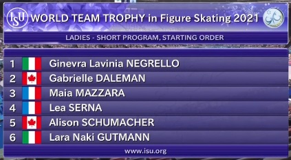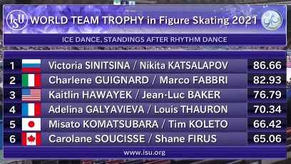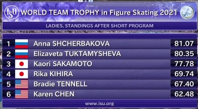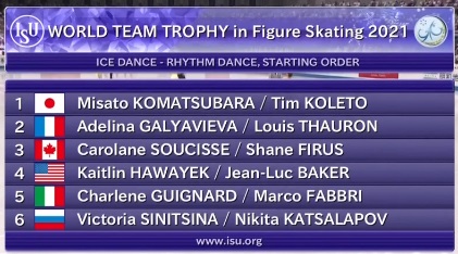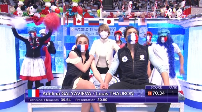 Сначала выступили японские фигуристы Мисато Коматсубара и Тим Колето, а затем откатали Аделина Галявиева и Луи Торон из Франции. Японцы набрали чуть больше 66 баллов, но французы их, скорее всего, обыграют за счет компонентов при похожей технике.