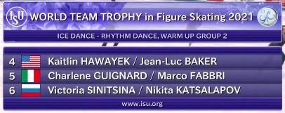 Вот расписание ритм-танца. Пары разбиты на две разминки по три выступления. Наши чемпионы мира завершат программу.