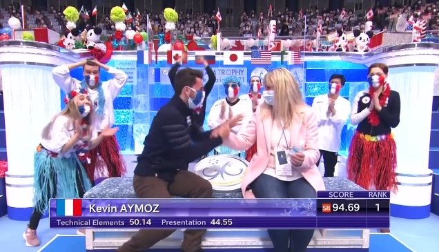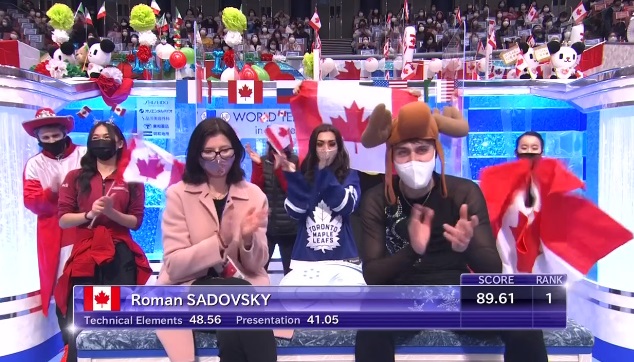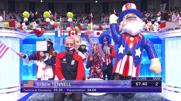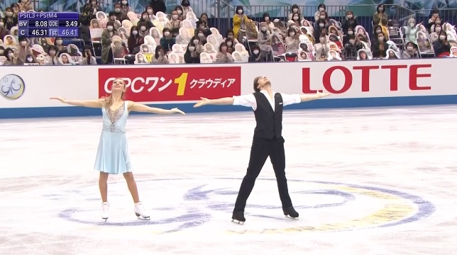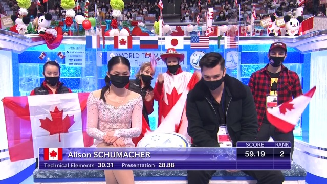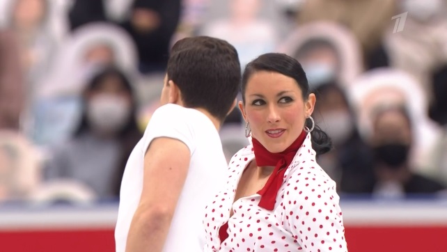 Ну что ж, канадский дуэт выступил в меру своих сил. Атмосфера в канадском углу слез и поцелуев не такая карнавальная, как у французов, но тут и состав менее опытный. Танец приятно смотрелся и чувственно. Что до оценок, то Сусис и Фирус проигрывают, хоть и чуточку, даже японцам.