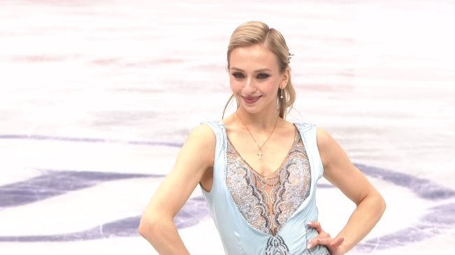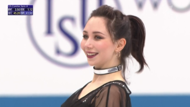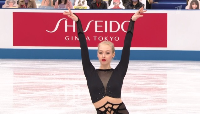 С этого проката будем освещать женщин подробнее. Начала с двойного акселя, затем сделала тройной лутц и после вращения четвертого уровня еще и каскад 3 флип + 3 тулуп. Все чисто. Дорожку шагов и все вращения оценили тоже четвертым уровнем! Очень сильный прокат! Лучше чем на ЧМ!