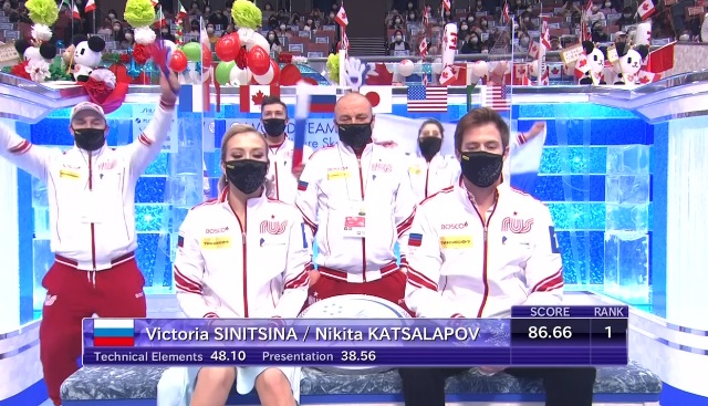 Отличная атмосфера в российском «кисс энд край», где с нашим дуэтом были тренеры и пара Мишина — Галлямов, которым сегодня не выступать. Синицина и Кацалапов не получили максимальные для себя оценки, но уверенно выиграли ритм-танец!