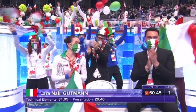 Гутманн каталась неплохо, но без ошибок у нее тоже не вышло. Недокруты там, выезды — по мелочи. Тем не менее это лучший ее результат в сезоне и первое место в первой разминке!