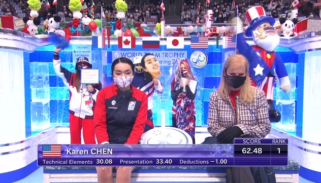Карен Чен откаталась неоднозначно. Возможно, акклиматизация повлияла и привела к ошибкам и падению. Это на 12 баллов меньше ее лучшего результата, но уровень таков, что Чен становится промежуточным лидером.