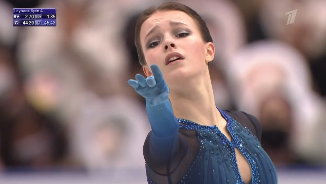 И сразу же чистый тройной аксель! Дальше блестяще исполненный каскад 3 лутц + 3 тулуп, вращение третьего уровня, чистый тройной флип, вращение уже на четвертый уровень, дорожка шагов, оцененная судьями в максимальный четвертый уровень, и финальное вращение тоже на четвертый. Блестящий прокат Императрицы!