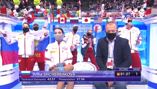 Неясное ребро на тройном флипе отметили арбитры, все остальное было чисто. Все прыжки докручены. В итоге Щербакова занимает на данный момент лидирующую позицию с новым личным рекордом!