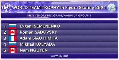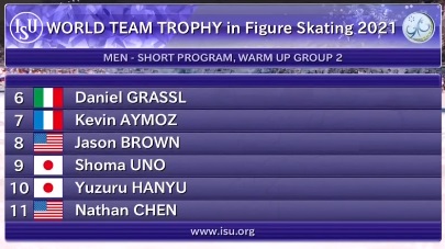 Начинается первая разминка у мужчин. Здесь сначала будет пять спортсменов, потому что у итальянцев сразу два фигуриста (и основной, и запасной) не смогли принять участие в турнире из-за коронавируса.