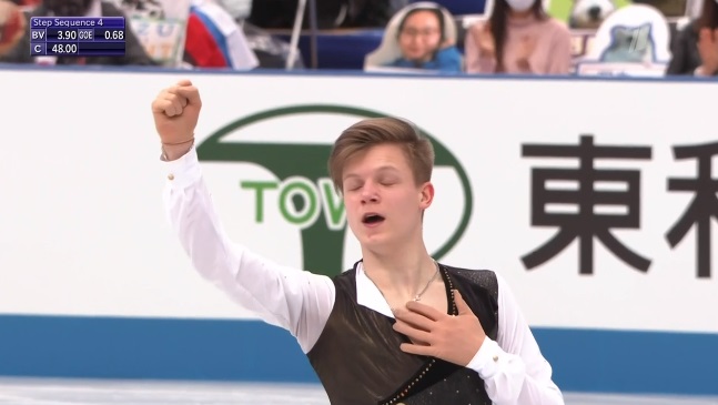 Сразу же отборолся и в итоге чисто исполнил и выехал в каскаде 4 тулуп + 3 тулуп, а затем чисто сделал еще и четверной сальхов! Блестящее начало 17-летнего россиянина, который затем отвращался на четвертый уровень и прыгнул тройной аксель — небезупречно, но и без ошибки. Дальше еще одно вращение четвертого уровня, дорожка четвертого уровня и еще одно вращение четвертого! Ух, великолпеный прокат!