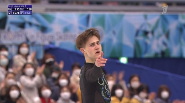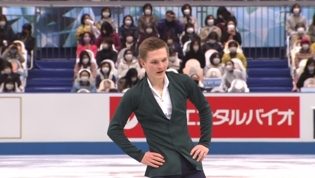 Начал с каскада 4 тулуп + 2 тулуп. Второй прыжок, конечно, должен был быть в три оборота. Затем с помарочкой на выезде сделал четверной сальхов. На приземлении с тройного акселя ошибка была уже явной — на две ноги. За дорожку шагов, как и за некоторые вращения получил только третий уровень.