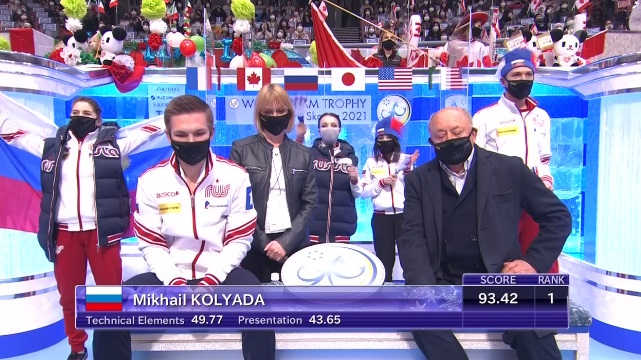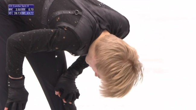 Сразу же отборолся на каскаде 4 тулуп + 3 тулуп, справившись прекрасно, на +2,47 GOE. Тройной аксель тоже прыгнул чисто. Вращение четвертого уровня, затем неплохой тройной лутц, дорожка шагов четвертого уровня и еще одно вращение на максимальный уровень. Чистый прокат Коляды!