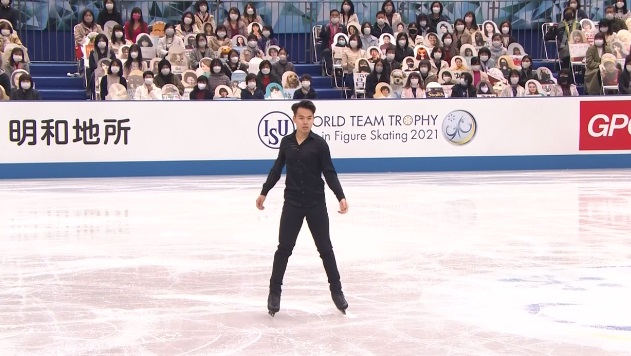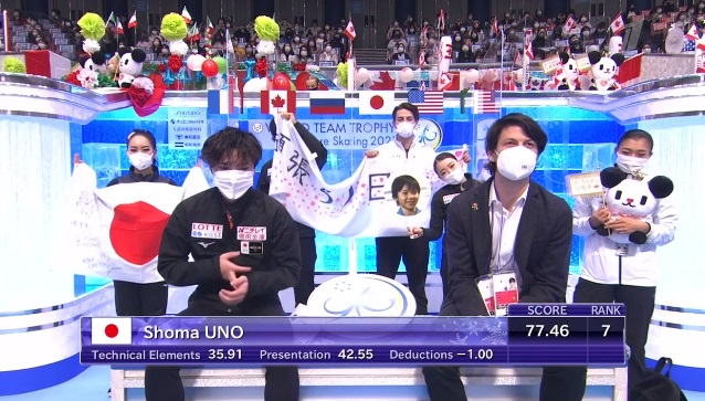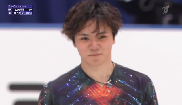 Уно, обладающий сложнейшим прыжковым набором, начинает с четверного флипа, правда, с ошибкой на приземлении. Дальше четверной тулуп, который должен был стать первой частью каскада, но не стал из-за падения! Вращение на четвертый уровень, сложный, но все же чистый выезд с тройного акселя. За одно из вращений получил только второй уровень, а финальное и дорожку шагов сделал на четвертый.