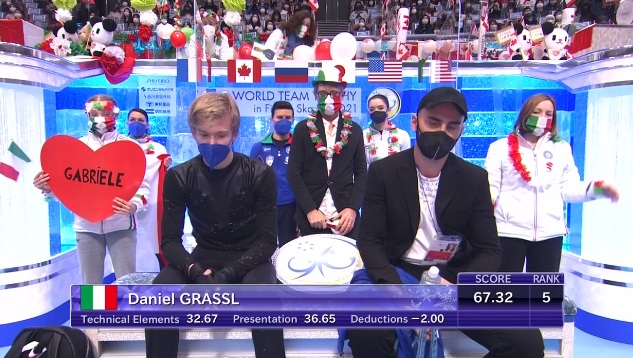 У Грассля очень сложная короткая программа, но начал он ее с падения на четверном лутце. А вот каскад 4 флип + 3 тулуп сделал чисто. Последовавшее за этим вращение получило от арбитров только второй уровень, и следом итальянец упал с тройного акселя. Дальше были вращение на четвертый уровень, дорожка на второй и еще одно, финальное вращение на четвертый. Жаль, не получился прокат у Грассля.