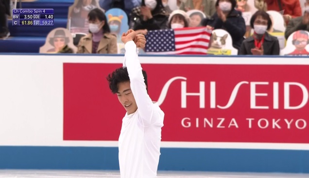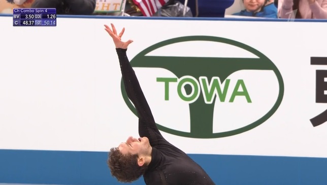 Сразу же шикарный четверной сальхов. Дальше отличный каскад 4 тулуп + 3 тулуп. Вращение четвертого уровня, потом тройной аксель, еще вращение четвертого уровня, дорожка шагов и последнее вращение — тоже предельной сложности. Шикарный прокат от двукратного олимпийского чемпиона!