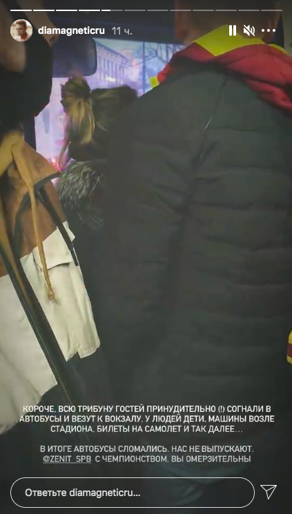 «Короче, всю трибуну гостей принудительно (!) согнали в автобус и везут к вокзалу. У людей дети, машины возле стадиона, билеты на самолет и так далее… В итоге автобусы сломались. Нас не выпускают. «Зенит», с чемпионством, вы омерзительны», — написал другой фанат «Локомотива» в Instagram (владелец компания Meta признана в России экстремистской и запрещена), также выставив видео из переполненного автобуса, в котором некоторые люди ехали стоя.