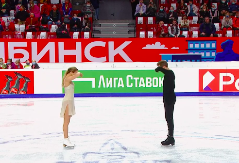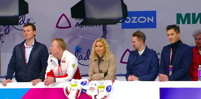 Эх, совсем не удался фигуристам финальный элемент — Морозов просто не поднял Тарасову в поддержку. Тутберидзе недовольно переговаривается с другими тренерами из команды. Сами спортсмены тоже недовольны и уже обменялись парой слов, а Морозов с укором посмотрел на девушку.
