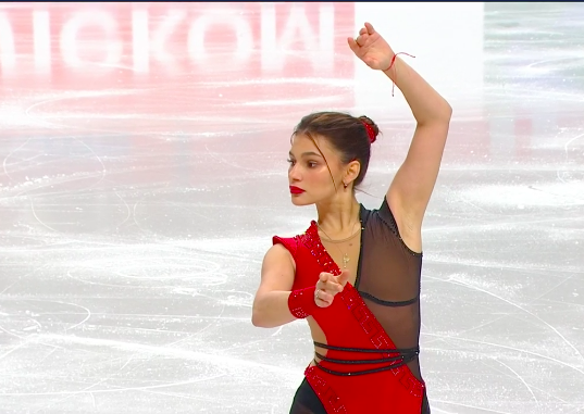 На льду — ученица Тутберидзе Майя Хромых, которая будет сегодня пробовать четверной сальхов и тулуп. Желаем удачи! Катается фигуристка под танго Роксан из фильма «Мулен Руж».