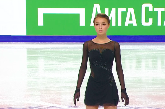 Больше Алена не пыталась заходить на триксель и ограничилась обычными тройными. Почти все прыжки фигуристка исполнила безупречно — только выезды с некоторых получились неуверенными, видимо, где-то были недокруты.