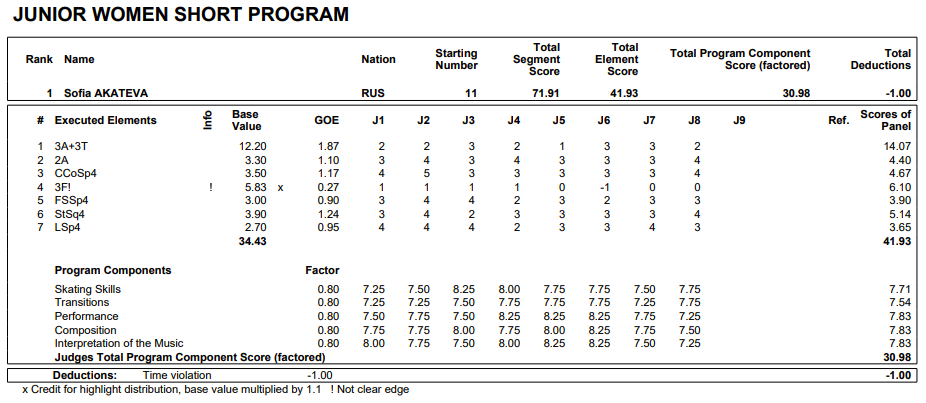 Кстати, стало известно, за что судьи сняли штрафной балл с Акатьевой (deduction): ученица Тутберидзе не уложилась в положенное время, то есть ее выступление длилось дольше, чем это разрешено правилами в короткой программе. Также судьи усомнились в правильности ребра на тройном флипе. Да, бригада в Гданьске очень строгая. Как бы там ни было, это не помешало Акатьевой стать первой после короткой программы. Протокол ее оценок выглядит так:
