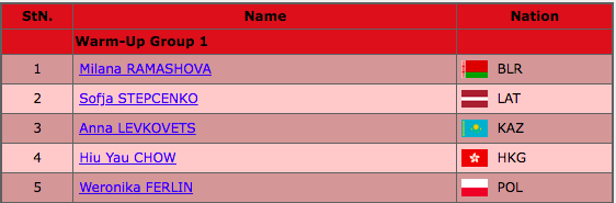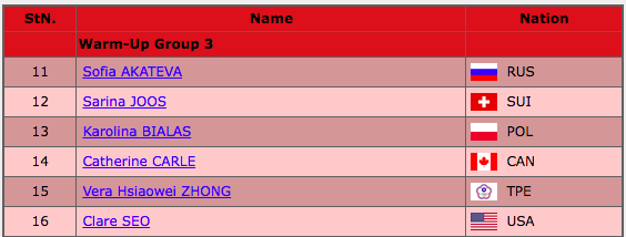 Открывает выступления последней разминки фигуристка из Австрии Эмили Саари. Она катается под композицию Orange Colored Sky (Stan Kenton, Willie Stein).