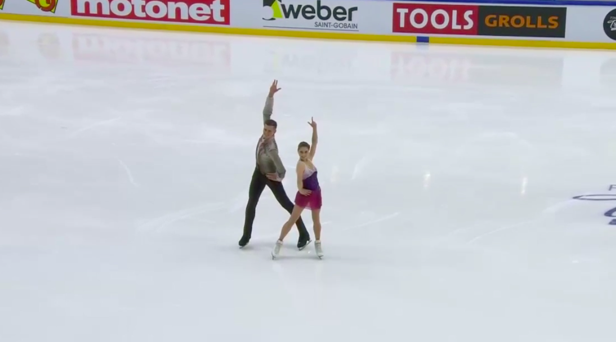 Сразу после предыдущего падения чешским фигуристам пришлось заходить на тройной выброс. Было нервозно, и девушка резко перевалилась на вторую ногу на приземлении, чтобы не упасть. Но хотя бы не второе падение подряд.