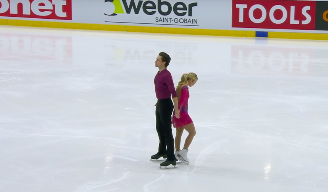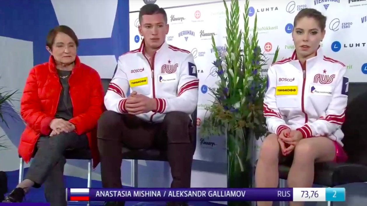 2) Действующие чемпионы мира из России Анастасия Мишина и Александр Галлямов оказались на втором месте (73,76 балла). Большую роль в этом сыграло падение Мишиной с параллельного тройного сальхова.