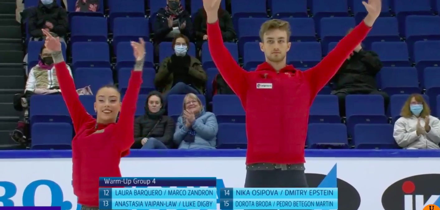 На льду разминаются четыре пары из второй разминки, включая недавно образованный звездный дуэт Ванесса Джеймс / Эрик Редфорд, которые выступают за Канаду. Зрители поприветствовали их особенно тепло.