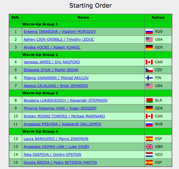 Началась разминка третьей группы выступающих, в которой есть чемпионы мира Анастасия Мишина и Александр Галлямов и известные канадцы Кирстен Мур-Тауэрс и Майкл Маринаро.