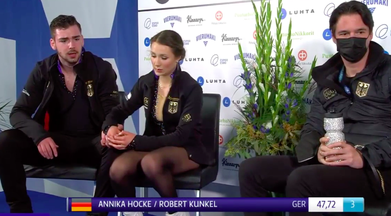 Следующими выступают Анника Хоке и Роберт Кункель из Германии. Они катаются под песню группы ABBA «Lay All Your Love On Me» (из фильма «Мама Мия»).